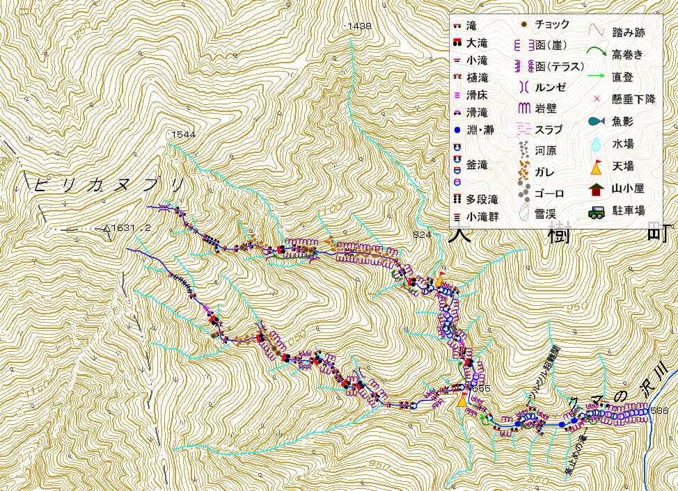 この沢は出合から源頭近くまで難しい滝が途切れることなく現れ、気を抜く間がない。現れる滝は困難ながらも快適な遡行が待っている。日高でも屈指の良渓である。