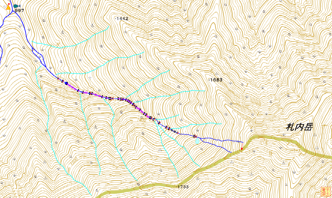 Co1100 付近からルンゼ状の岩盤の沢となって、滑滝が延々と続くようになる。いずれも素直な順層の滑滝で、ほとんどが直登可能だ。このルンゼ状の流れは Co1390 二股まで続く。 Co1540 で冷水の滝を登ると源頭となって水が湧き出している。涸沢となって灌木のトンネルの中の沢形を詰め、ハイマツに突き当たったら灌木の隙間を縫って右に5分もトラバースすると稜線に出る。右側のお花畑に少し降りると踏み跡が見つかる。見所は少ないが、滑の連続で快適な沢だ(⌒ン⌒)。