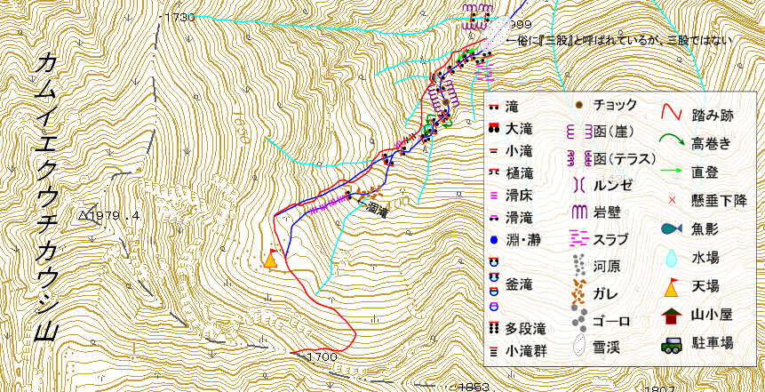 カムイエクウチカウシへ向かう本流は Co999 三股までは単調な河原が続いている。踏み跡は左右に渡渉しながら続いている。俗に『三股』と呼ばれるこの場所は、 Co999 でルンゼ状の右股が合流し、 Co1030 でピラミッド峰のカールから流れる左股がスラブ状の二本の滝となって合流する、変速二段階の三股である。本流は標高差 80m の連瀑となって突き上げている。左岸には登山道化した巻き道が付いている(巻き道ルート参照)が、中を行った方が断然面白い。連瀑を登り切り、三方から沢が合流するお椀状の滝から左に進み、屈曲し函状を通過すると、直登出来ない滝もいくつか出てくるが、いずれも簡単に高巻くことが出来る。 Co1310 二股はどちらを通っても八ノ沢カールに出る。カールからは踏み跡をたどり、カムエクとピラミッド峰のコルに出る。コルからはカムエクへもピラミッド峰へも明瞭な踏み跡がある(⌒○⌒)。